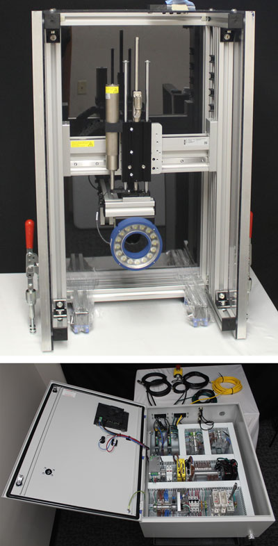 Custom inspection system with AI capable camera, telecentric lens and ring light mounted to a 2-axis robot to conduct a pass/fail inspection on a part. System also includes a PLC, HMI, panel PC and master control panel.